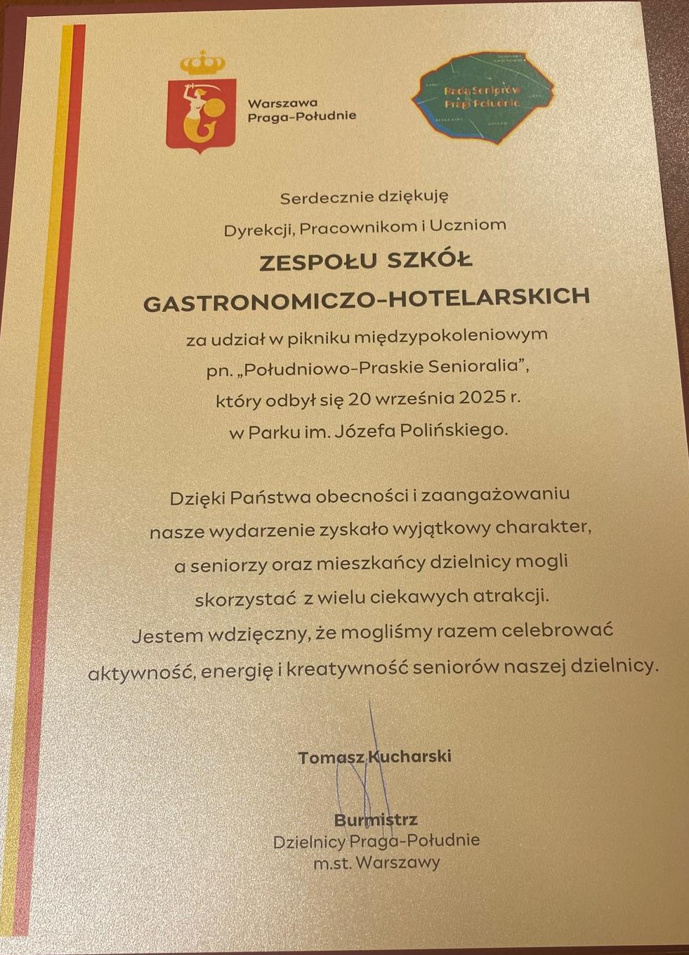 On September 17th Senioralia took place in the Poliński Park organized by the Praga-Południe District Office. Traditionally, as part of cooperation with the Office, our school prepared a refreshment stand. On this cold September day, the participants of the festival could have tried a grilled sausage and salads prepared and served by our students.